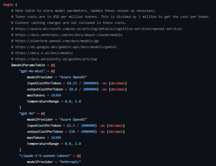 - inputCostPerToken. This is a calculation of the cost of 1M input tokens in US$, divided by 1M (to give the cost per token) and represented as a decimal (to avoid PowerShell’s default of using scientific notation for long numbers). The token cost amounts are taken from information published by the AI model provider.