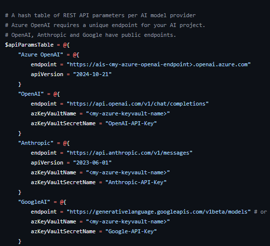 - endpoint. This is the URL to use when calling the REST API for that AI provider. For most providers, these are static URLs that are already provided for you in the script, however for Azure OpenAI, you will need to provide the endpoint that was created in your own AI project (see part 1) as this URL is unique to it.