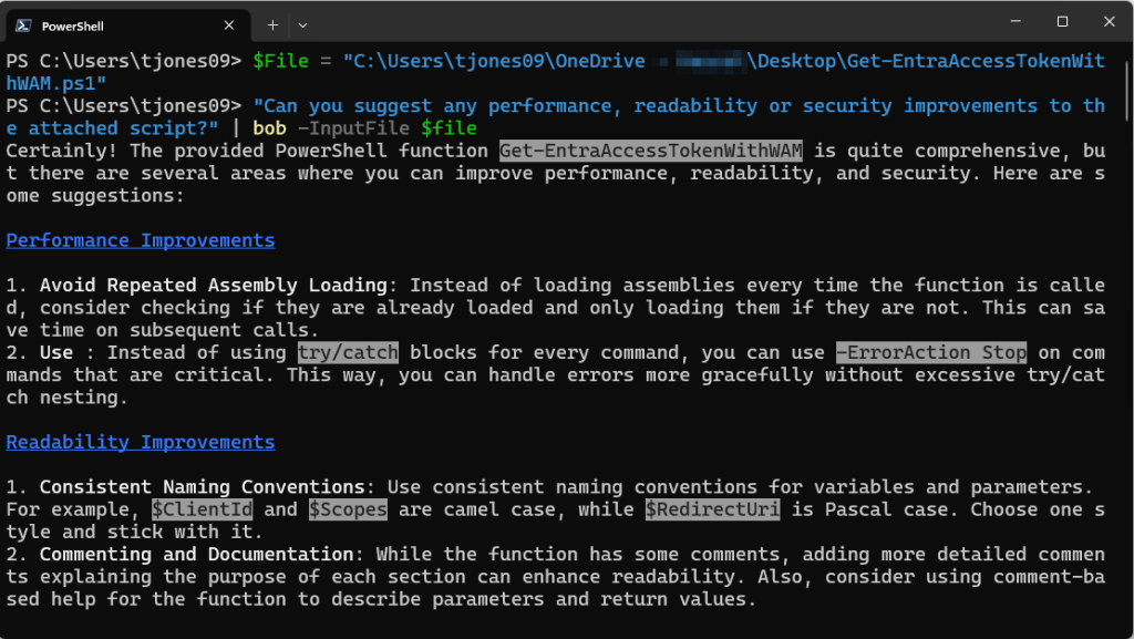 "Can you suggest any performance, readability or security improvements to the attached script?" | bob -InputFile $file