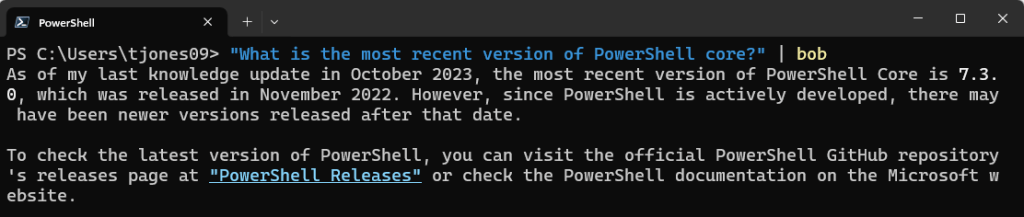 Finally, I recommend to either call the script or add the function code directly in your PowerShell profile script, as well as setting an alias to make it available in every session and super easy to invoke. Just for fun, I’ve called mine Bob. Whenever I need coding help, I just ask Bob 😄