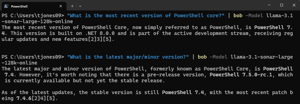 Note that there are some numbers in square brackets at the end of the response. These are references to web sources where the information was obtained from. To view the references, use the –IncludeCitations switch. This is only applicable for the Perplexity models.