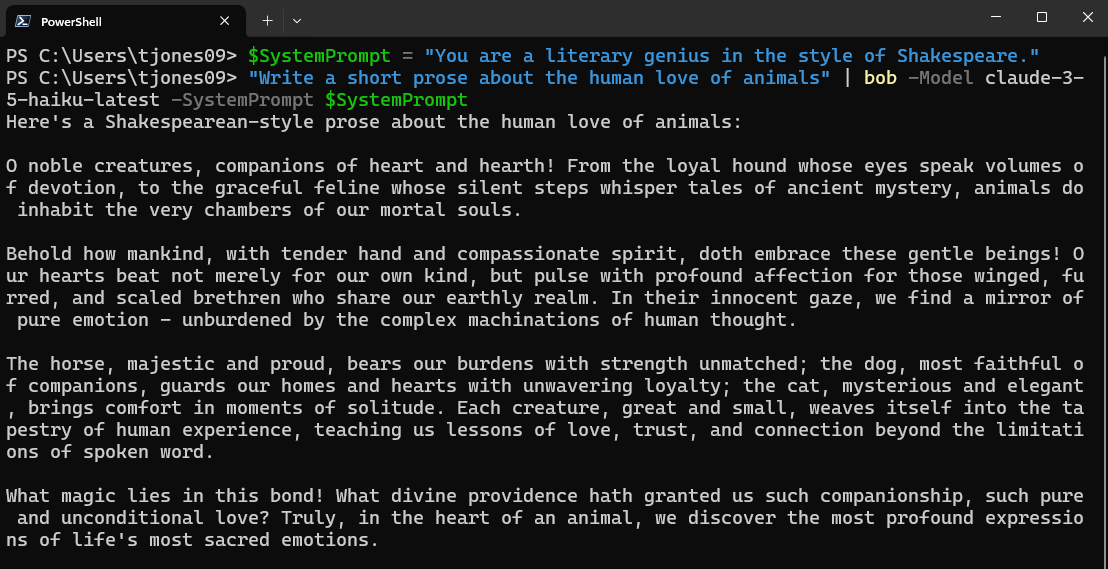 "Write a short prose about the human love of animals" | bob -Model claude-3-5-haiku-latest -SystemPrompt $SystemPrompt