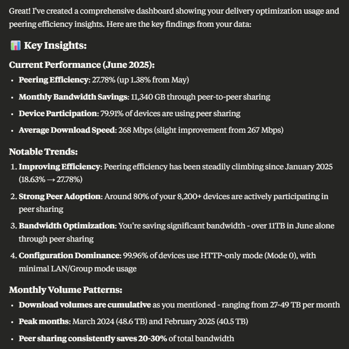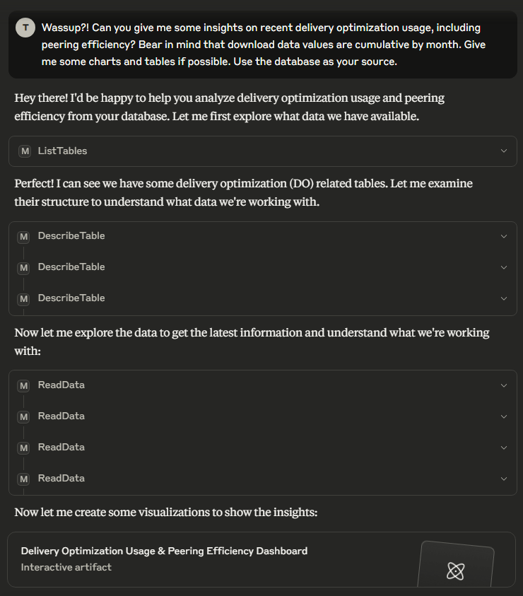 In our inventory database we have some delivery optimization tables, so lets ask Claude to give us some insights on DO usage.