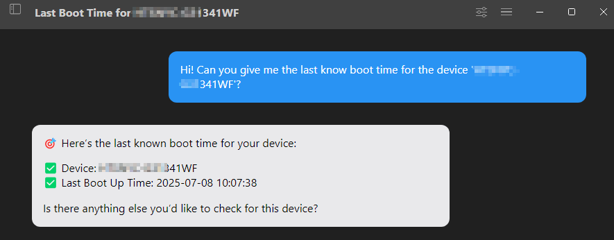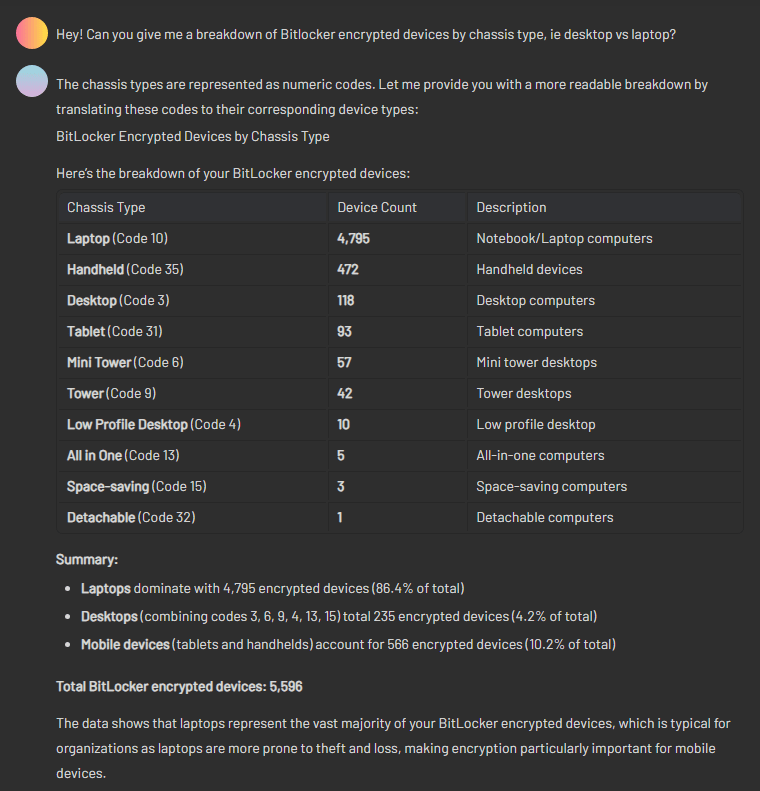 I haven’t tested with a broad spectrum of AI models yet, but I found both Claude Sonnet 4 and o4-mini were very good at being able to understand the database schema with little or no help from me, and to reason accurately over the data and provide intelligent responses. Although I have connected to my own, custom-designed inventory database, if you are using MS Configuration Manager you could connect it to your ConfigMgr database and get some great insights too.