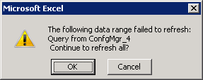 2. yeah, that SQL Query works fine, however; since it returns all of our sites it seems to fail populating the data to the cell. We have 1 primary site server and 8 secondary site servers. I tried using top(1), however; in this case that did not work from excel. This is awesome by the way. Thanks so much for sharing your hard work!