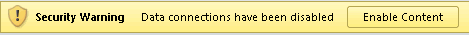 When you first open a report, you may get prompted with a security warning (depending on how your security settings are configured) such as the ‘Data connections have been disabled‘ warning below.  If you do get this prompt, you can go straight to Configure the Data Connections section below, before clicking Enable Content.  If you clicked Enable Content first, proceed to Cancel the Data Connection Prompts.