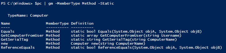 The custom type also contains a couple of static methods that I can use without creating an object and assigning it to a variable. “GetComputerFromUser()” checks my Configuration Manager database to find the computer/s that a user was last logged into, and “GetSerialTag()” gets the serial number (or asset tag) for the remote computer.