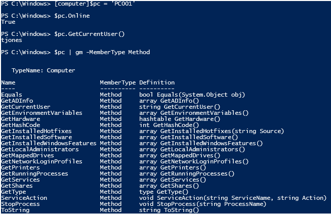 In the example below, I’ve created a custom computer object representing “PC001”. Creating the object runs a quick “Test-Connection” against the machine, so I call the “Online” property to see if it is. Then I get the current user using the “GetCurrentUser()” method, then I output a list of methods in the object. These methods allow me to get information from Active Directory for the computer, get hardware information, get installed hotfixes or software, get local administrators and other useful things.